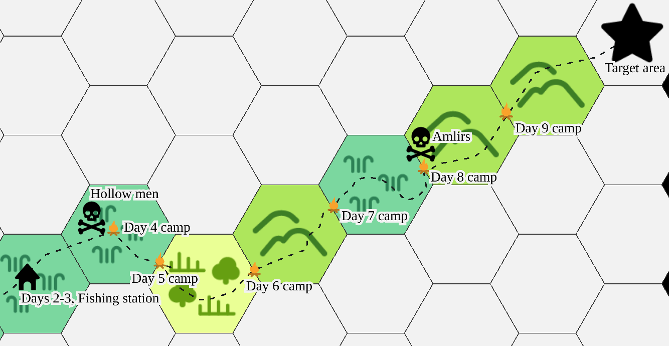 High winds make traveling difficult. The wetlands dry and become thickets. Day 7